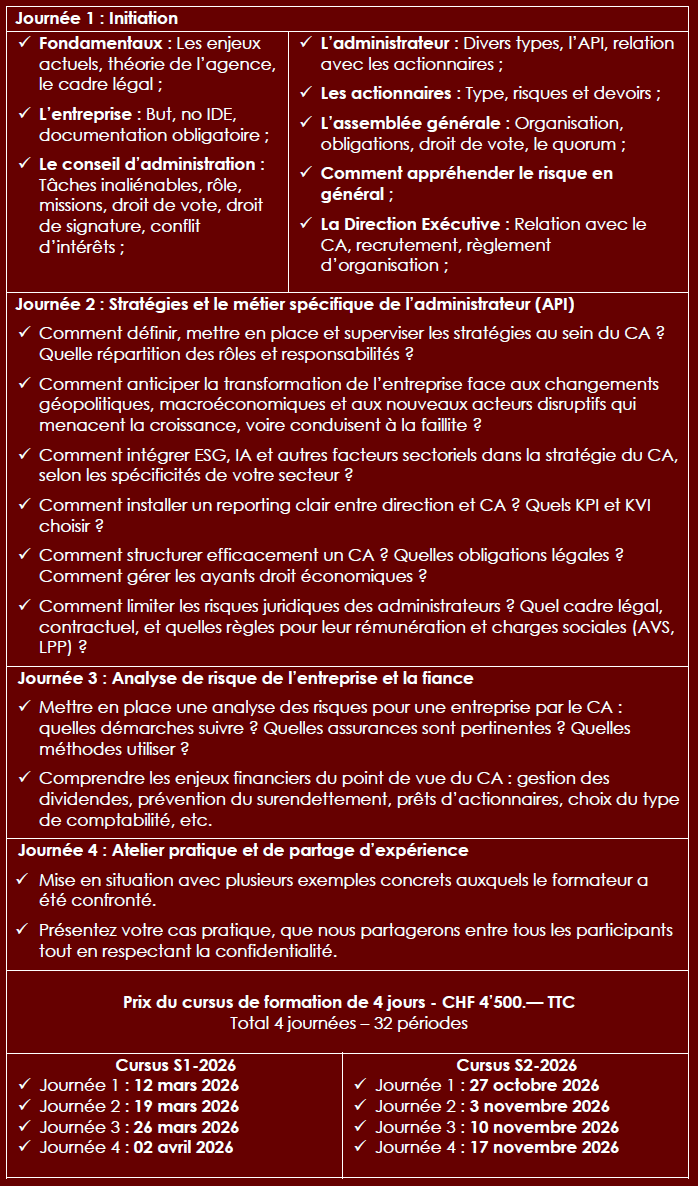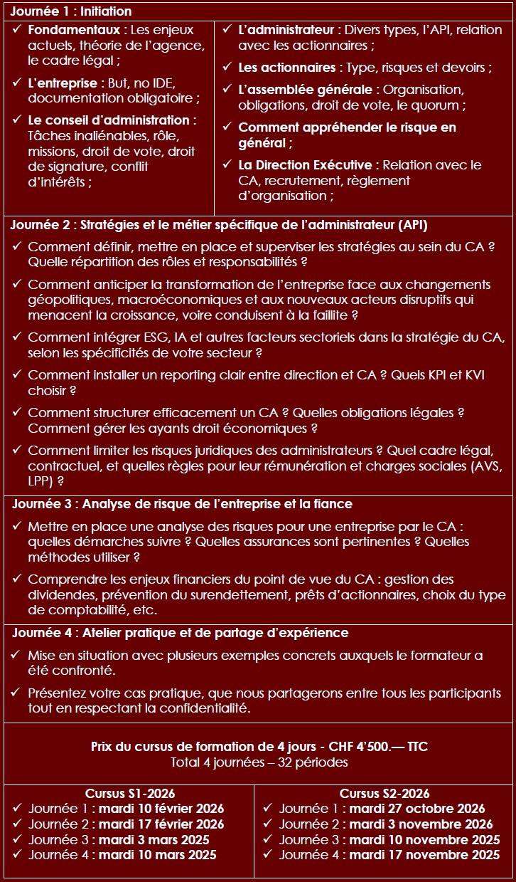 Formation en gouvernance d’entreprise pour administratrice et administrateur Nous proposons un cursus de formation sur 4 jours en présentiel